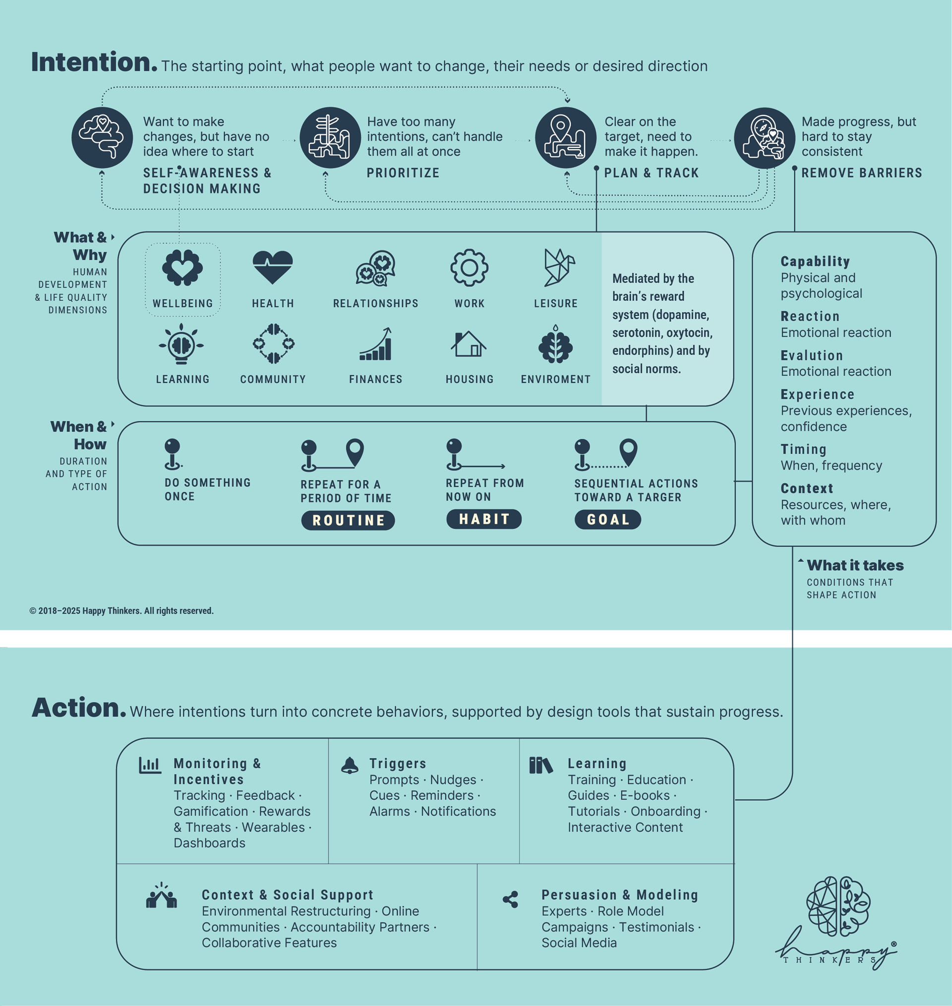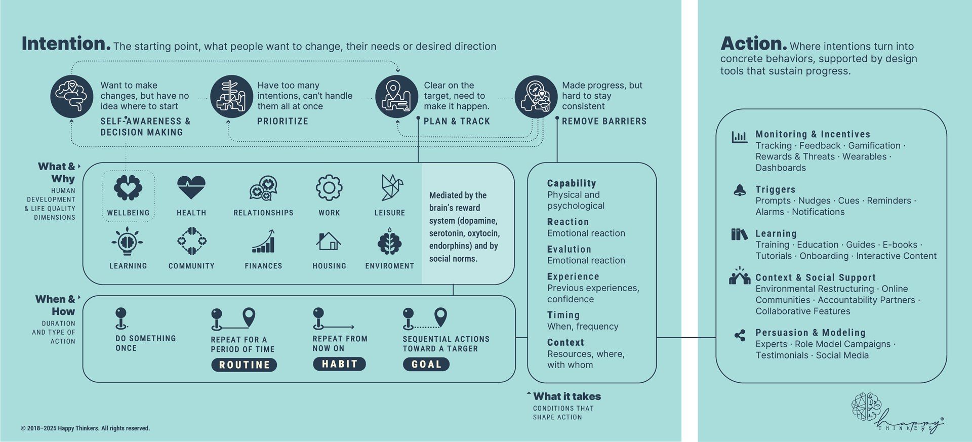 Born from research and collaborative design, this framework serves as the core of the Happy Thinkers Behavioral Design System. It is a modular, scalable model that bridges the intention–action gap by defining a consistent user journey: Intentions Insights Actions. This structure ties together the entire multichannel brand experience (website flow, physical tools, digital spaces, and visual identity).
